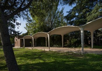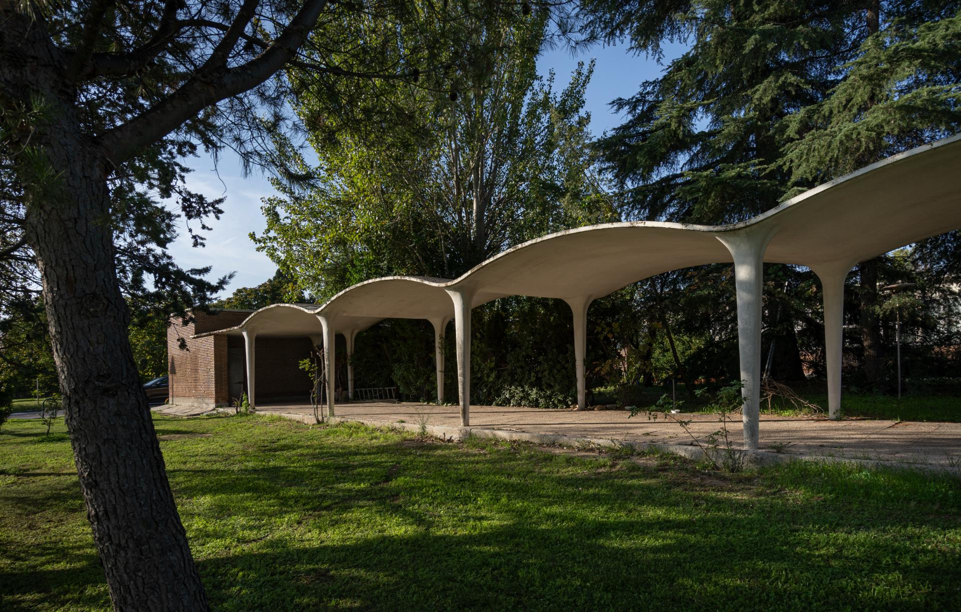 Los cuerpos alargados y las galerías se integran con los dos laboratorios con forma de sector circular, que rememoran las aulas magnas de las facultades cercanas. La utilización de paños de ladrillo visto y la estricta modulación de los huecos contrastan poderosamente con la ligera curvatura de las sorprendentes galerías de hormigón, delimitadoras virtuales del elaborado paisaje artificial creado por Fisac que, a su vez, se abren al entorno natural de Madrid.