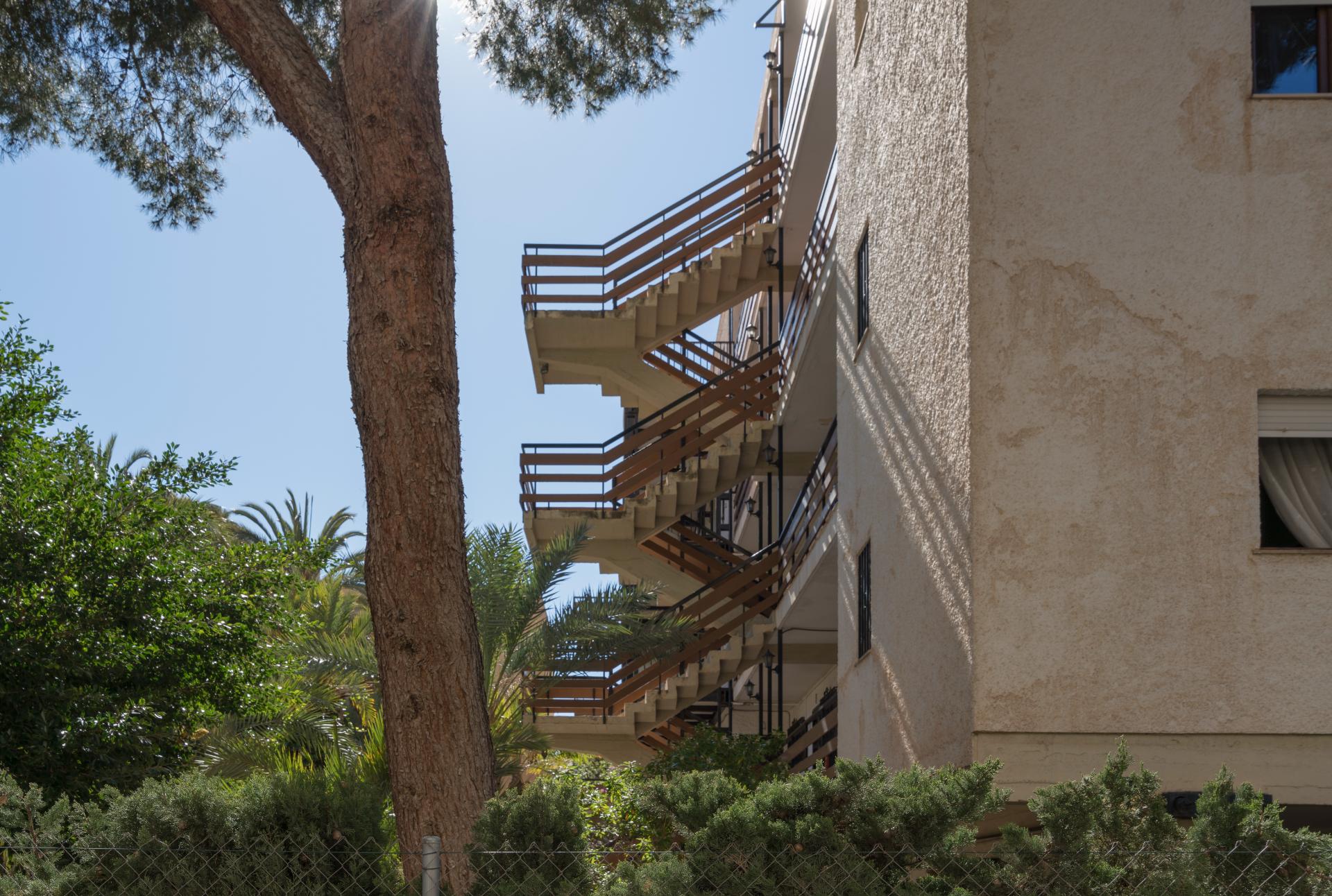 La solución de las terrazas, en diente de sierra, aúna estética y funcionalidad, dirigiendo por una parte las vistas hacia el mar y mejor orientación, y simultáneamente los amplios paños rítmicos de celosía cerámica cualifican la vocación de la edificación en su entorno.