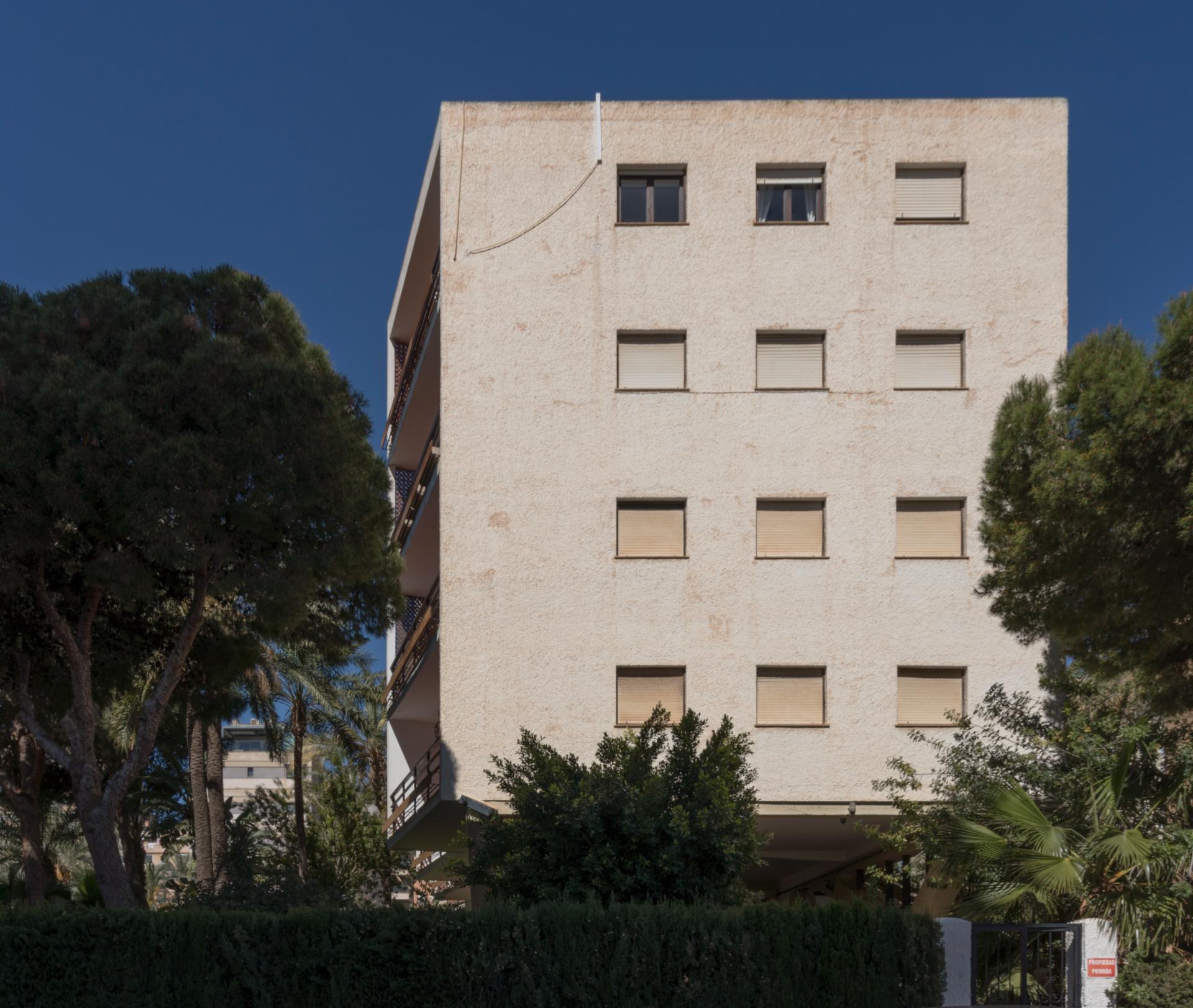 Fernando Cassinello aborda el diseño de dieciséis apartamentos turísticos en la interesante urbanización de Aguadulce mediante una solución estructural de gran originalidad. Las exigencias normativas de disponer la planta baja diáfana la resuelve apoyando todo el edificio en unos amplios arcos rebajados de hormigón armado. La expresión de la estructura también se refleja en las escaleras voladas de los corredores de acceso en la fachada posterior.