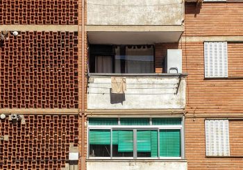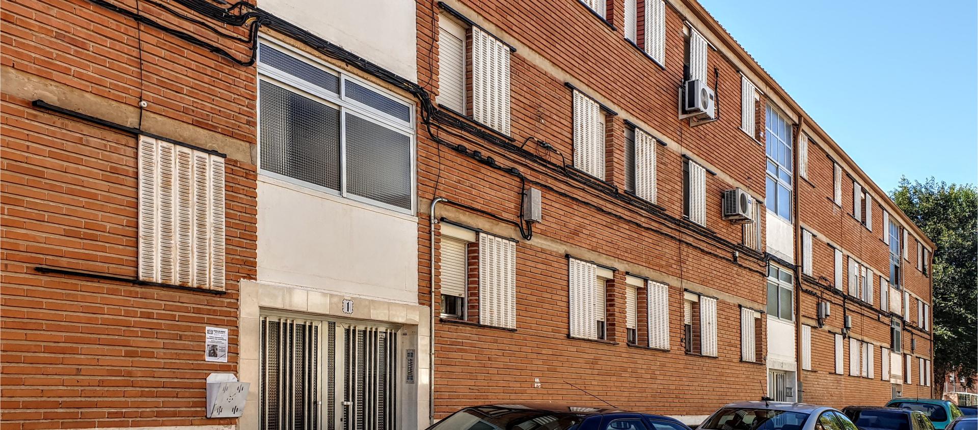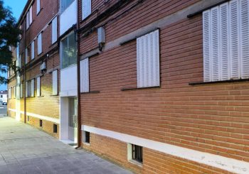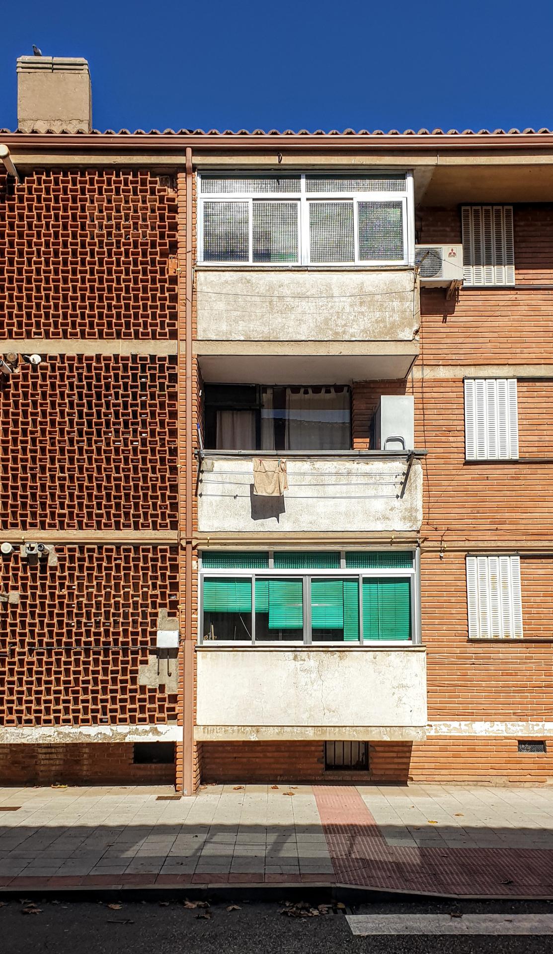 El aspecto exterior de estos edificios de tres alturas es sencillo y sincero. El canto de los forjados interrumpe la textura cerámica del ladrillo visto de los muros perimetrales. La horizontalidad de la cubierta se intensifica por el contraste del color blanco empleado en los antepechos de los descansillos, en los balcones del estar-comedor y en las contraventanas.
